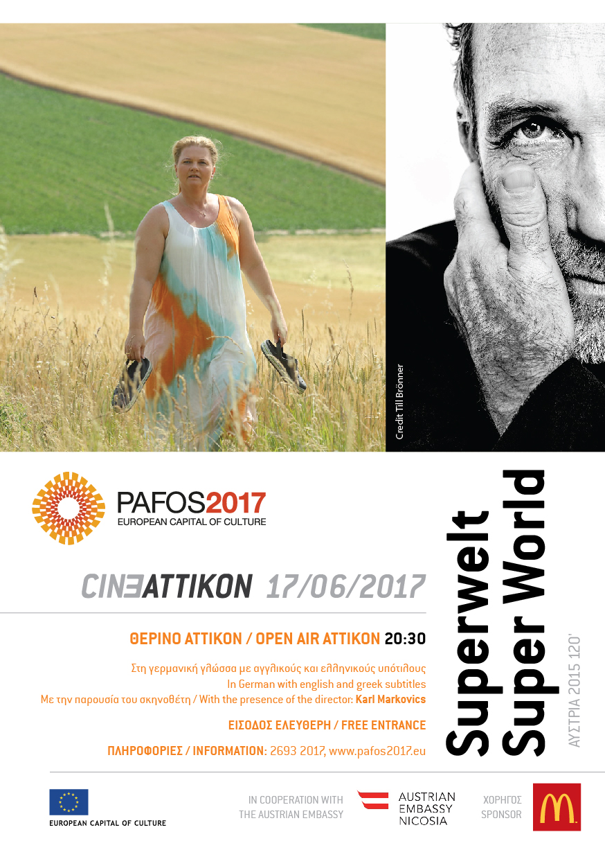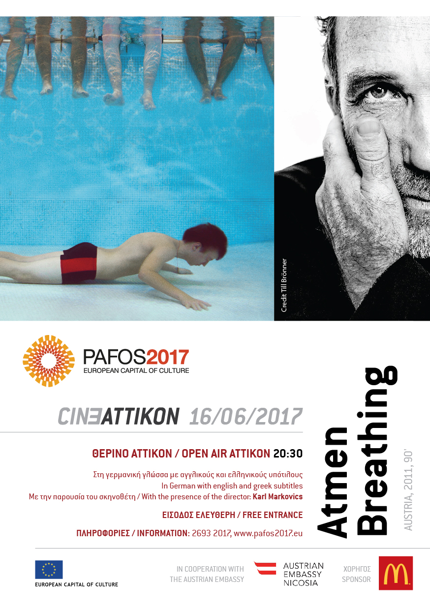 Το πρόγραμμα “Cine Attikon” περιλαμβάνει ταινίες από τον ευρωπαϊκό κινηματογράφο, αναδεικνύοντας δημιουργούς και έργα που έχουν διακριθεί σε διεθνή φεστιβάλ, με τη βοήθεια Πρεσβειών και Ξένων Αντιπροσωπειών στην Κύπρο και με Χορηγό την εταιρεία McDonald’s. Tο διήμερο αυτό, ο Οργανισμός Πάφος2017 παρουσιάζει τις ταινίες “Atmen” και “Superwelt”, με τη συνεργασία της Πρεσβείας της Αυστρίας. Οι δύο ταινίες, είναι ένα αφιέρωμα στον Αυστριακό ηθοποιό, σεναριογράφο και σκηνοθέτη Karl Markovics, ο οποίος θα παραστεί στις δύο προβολές και θα συνομιλήσει με το κοινό.