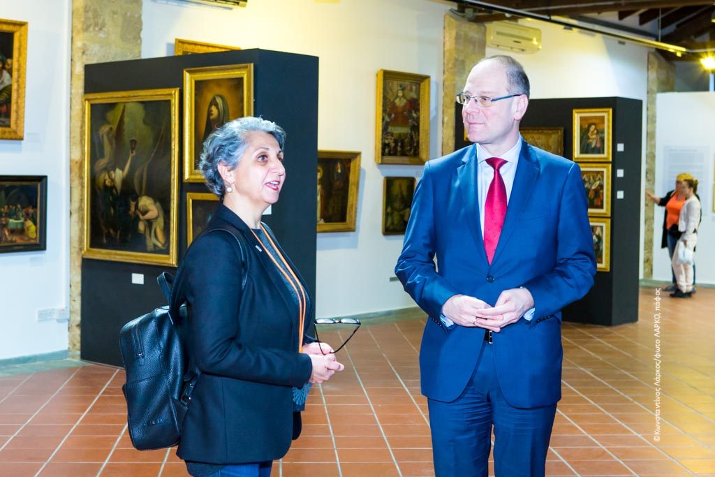 The European Commissioner made its first stop in Pafos with a visit at the Archaelogical Park and the exhibition of the European Capital of Culture Pafos2017 “Depicting the Invisible – Christian Art” by Christoforou Collection at En Plo Gallery. The exhibition had its opening just a week ago by the Archibishop of Cyprus.