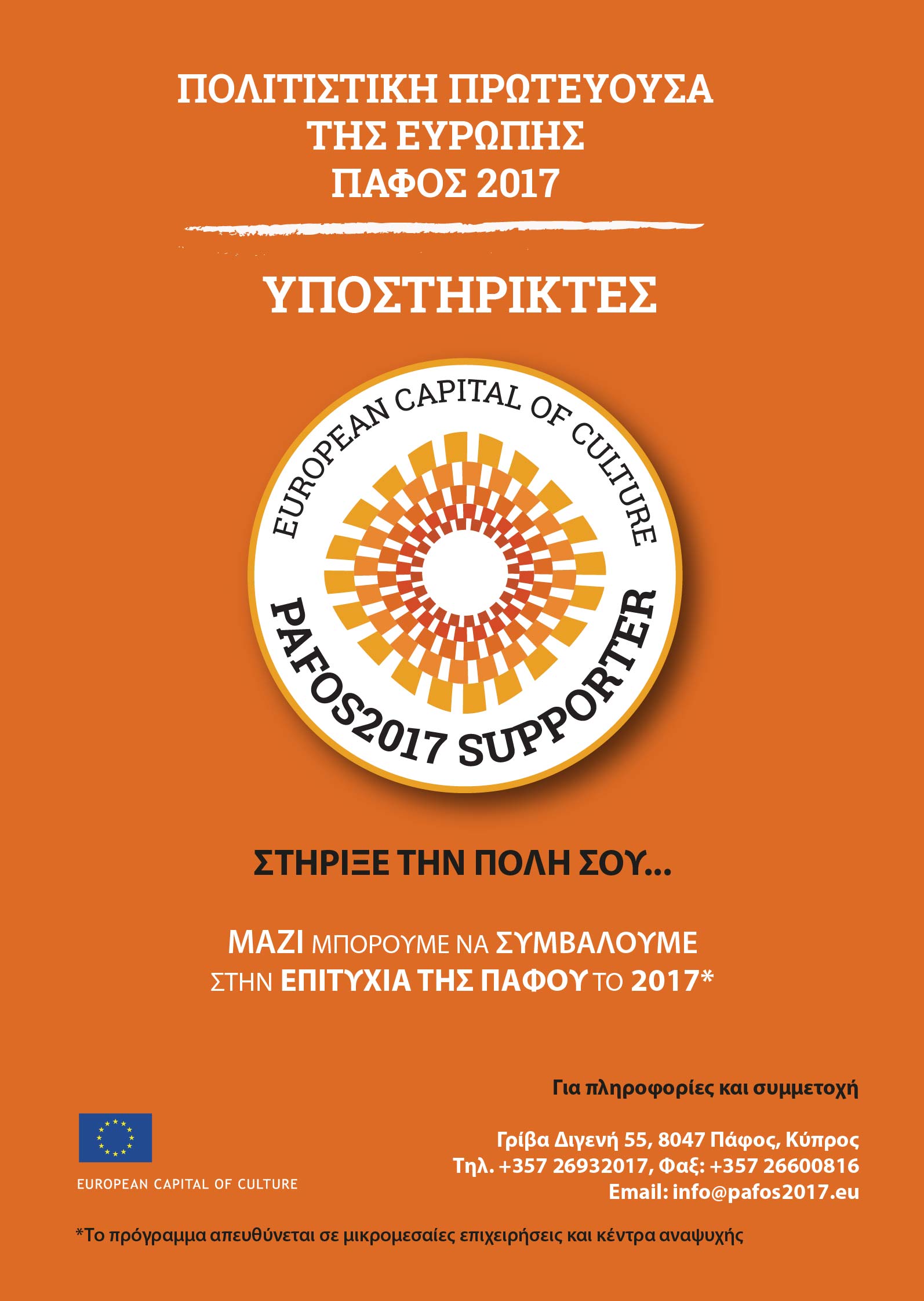 Ο Οργανισμός Πολιτιστική Πρωτεύουσα της Ευρώπης – Πάφος2017 αρχίζει το Προγράμμα των Υποστηρικτών του Πάφος 2017, που έχει ως στόχο την συμβολή, την εμπλοκή καθώς και την ενεργή συμμετοχή των μικρομεσαίων επιχειρήσεων, σε αυτό το μεγάλο γεγονός που θα συμβεί στην πόλη μας το 2017.